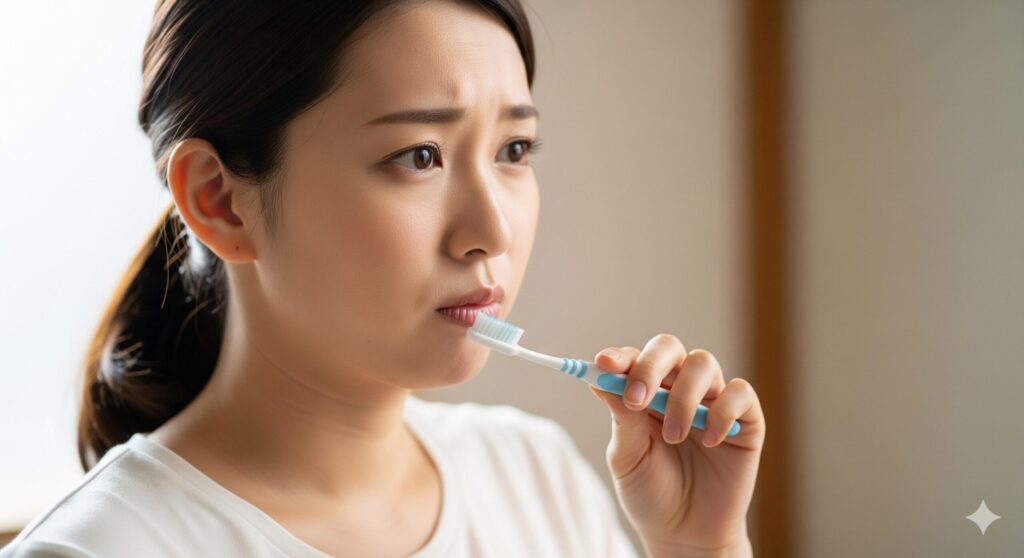 A4. 無理に歯磨きをする必要はありません。気分が良い時に、ヘッドの小さい歯ブラシを使って、香りの強くない歯磨き粉で手早く磨くなど、工夫してみましょう。それも難しい場合は、水でうがいをするだけでも効果があります。食生活も、糖分の多いものを控え、キシリトールガムなどを活用するのもおすすめです。お一人で悩まず、ぜひ当院にご相談ください。